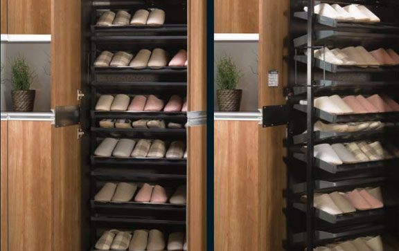 小户型通常玄关更小,这时候旋转鞋架就排上了用场,在同样的鞋柜柜体中,可以让您拥有翻一倍的鞋子收纳量。